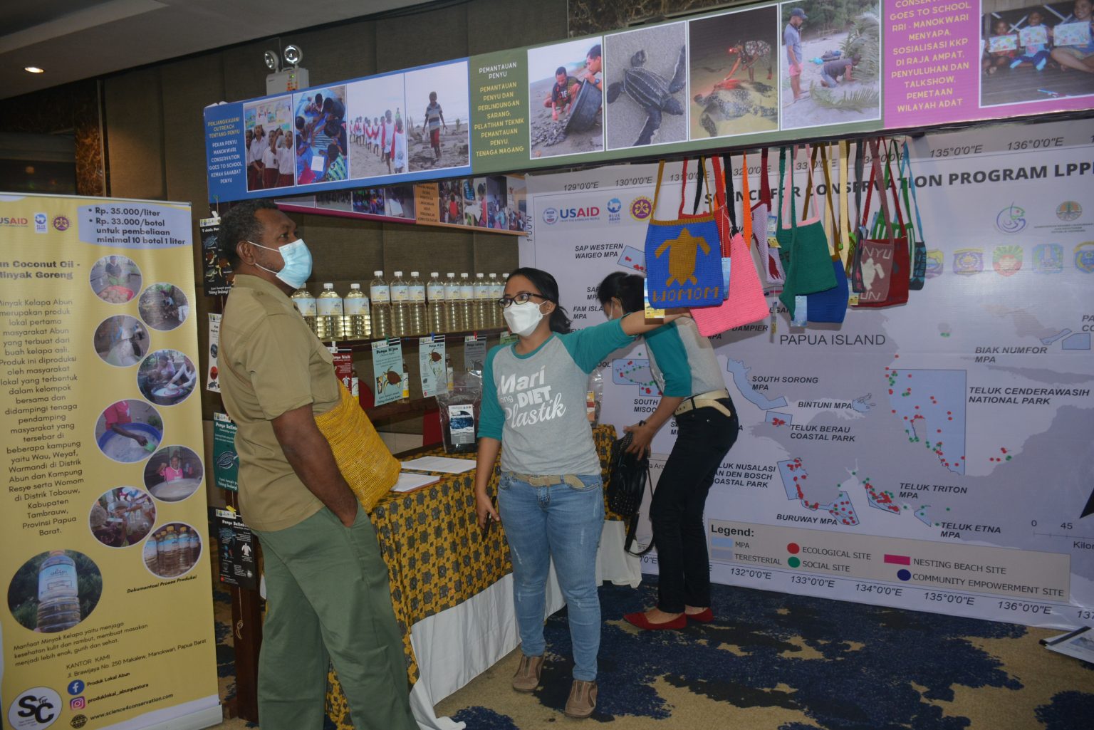 Kami para staf program Sains untuk Konservasi juga terlibat aktif dalam mempersiapkan kegiatan ini. Persiapan yang kami lakukan berupa mengumpulkan koleksi foto-foto kegiatan yang telah kami lakukan di lapangan, mencetak foto menjadi banner, dan mempersiapkan booth di tempat pelaksanaan kegiatan. Beberapa staf dari masing-masing program bekerja sama mempersiapkan booth ini. Kami menata buku-buku laporan kegiatan, memajang foto dan poster, menggantung noken, dan mengatur produk turunan kelapa seperti minyak kelapa, VCO, cocopeat, coco fiber yang dibuat oleh masyarakat di Abun.
